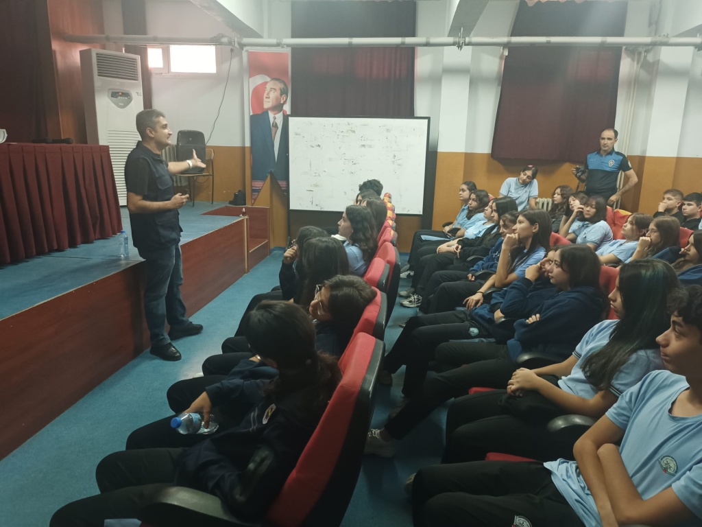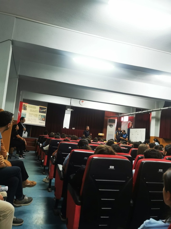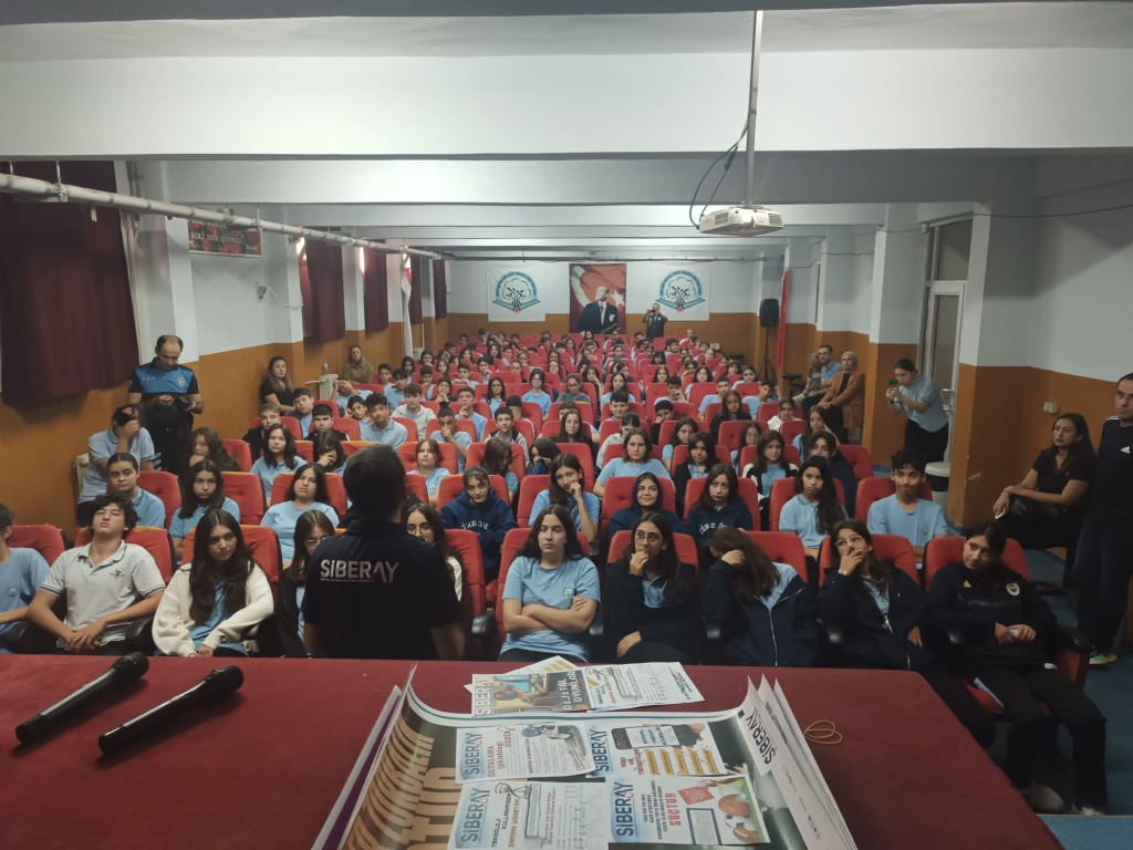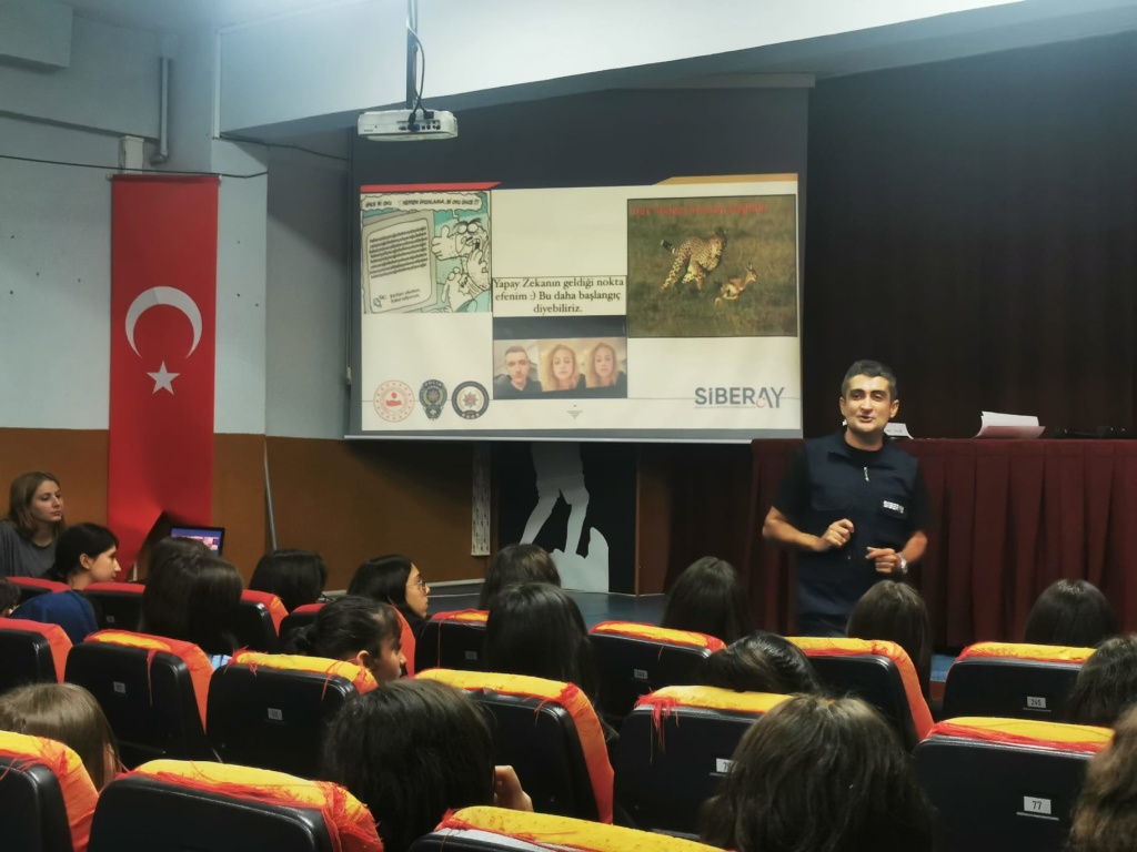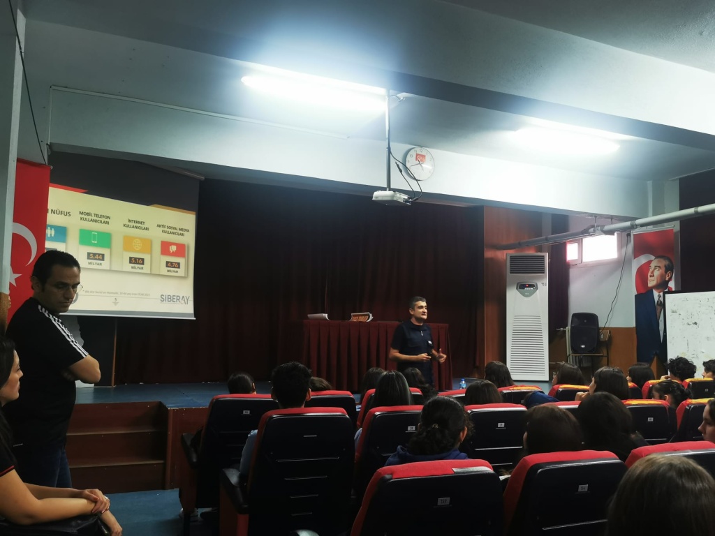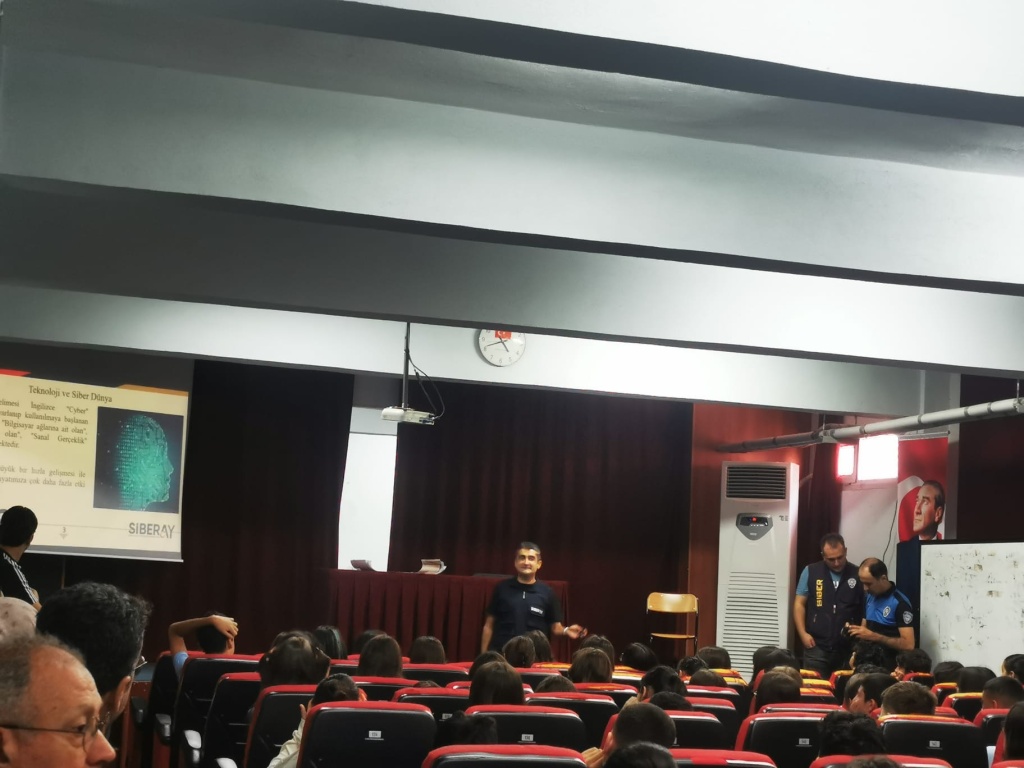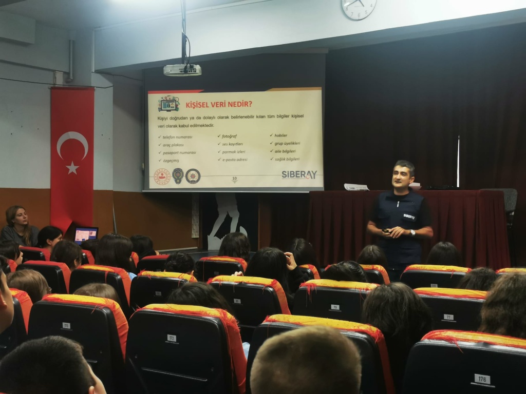 Siberay projesi kapsamında Emniyet Genel Müdürlüğü Siber Suçlarla Mücadele Birimi tarafından okulumuzda siber güvenlik semineri düzenlendi. İnternetin güvenli kullanımı, dijital bağımlılık, siber zorbalık ve kişisel verilerin korunması gibi konular üzerinde duruldu. Öğrencilerle etkileşimli olan bu seminerde öğrencilere sorular soruldu, onların görüş ve düşüncelerine yer verildi. Öğrenciler, günlük yaşamlarında karşılaşabilecekleri tehlikelere karşı bilinçlendirilirken aynı zamanda teknolojiyi doğru ve faydalı bir şekilde kullanmanın önemi de vurgulandı.
